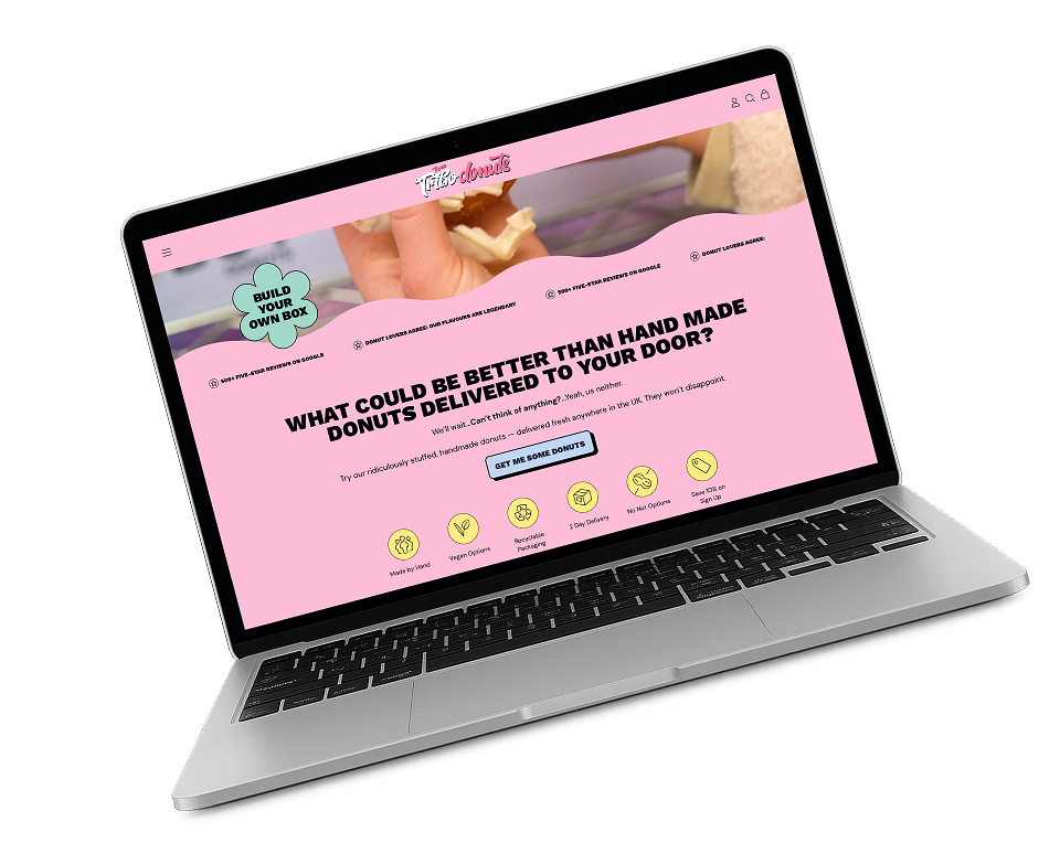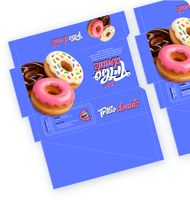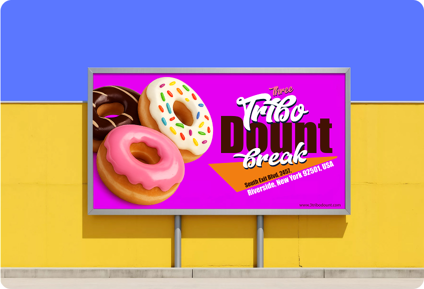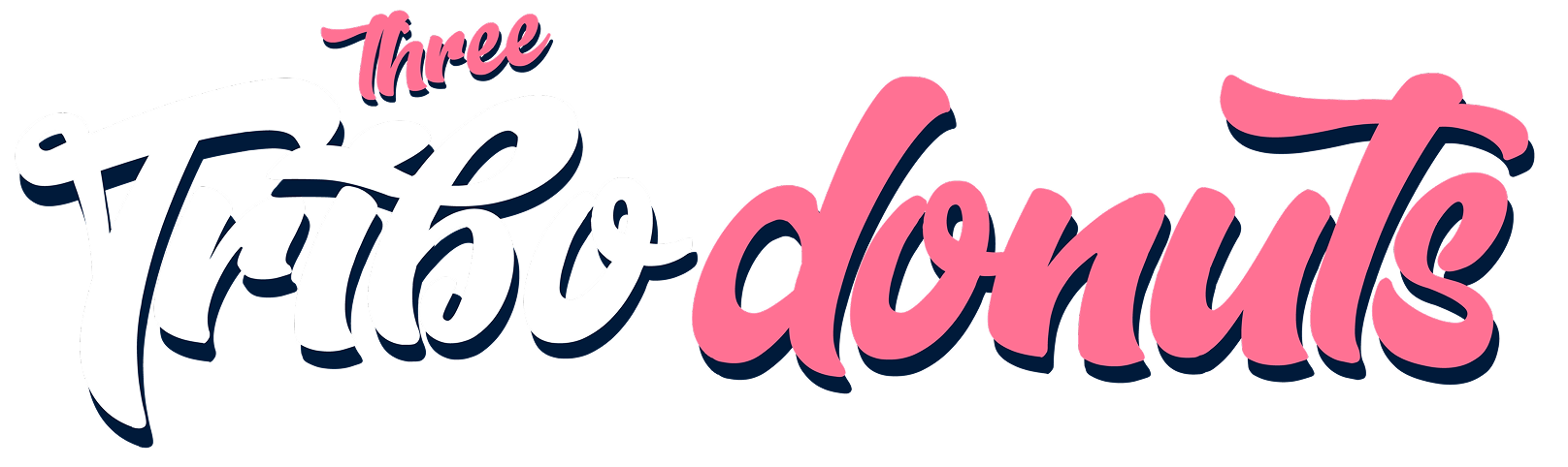 Here is a logo that has been appliedacross various media Three Tribo Donuts from websites and billboards to t-shirts maintaining recognizability, consistency, and the brand's visual identity in all formats.